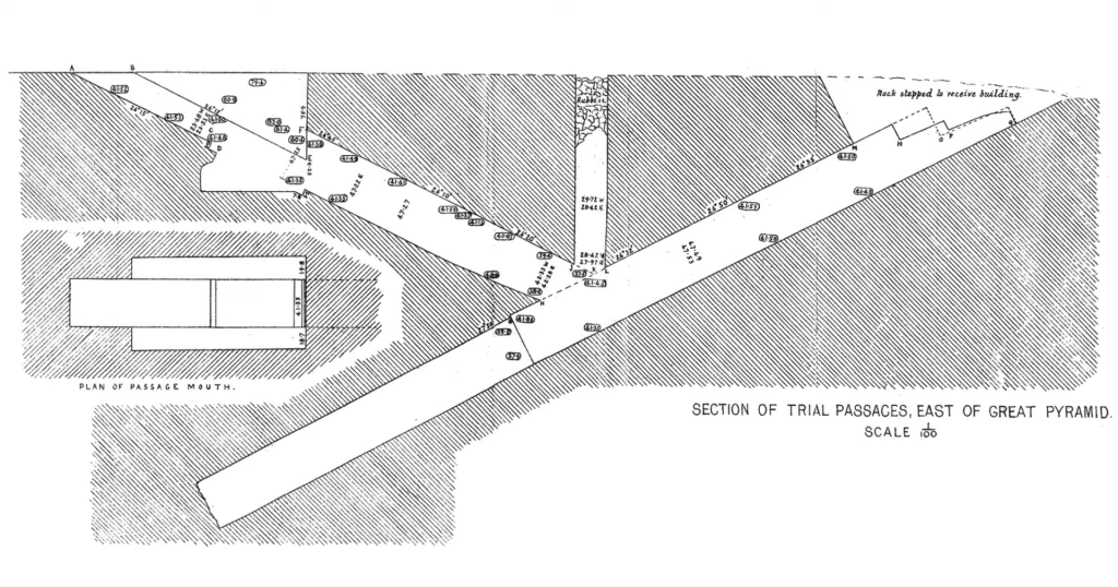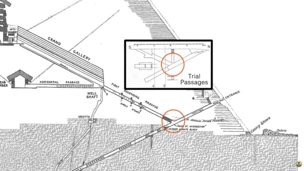 They are oriented at the exact same angles, perfectly mimicking the intersection in the pyramid, but with a hidden twist; a vertical shaft ascending straight upward from the intersection. This extra feature is found in the Trial Passages, but in the pyramid, we can only speculate if it exists or not, as a large granite plug stone is currently in place that Stijn and I both believe could be concealing the extra shaft. This suggestion was also proposed by Mark Foster in his paper THE TRIAL PASSAGES: A MESSAGE IN STONE? [LINK], and also by Matt Sibson in his video titled The Key to Unlock the Great Pyramid of Egypt: The Trial Passages [LINK].